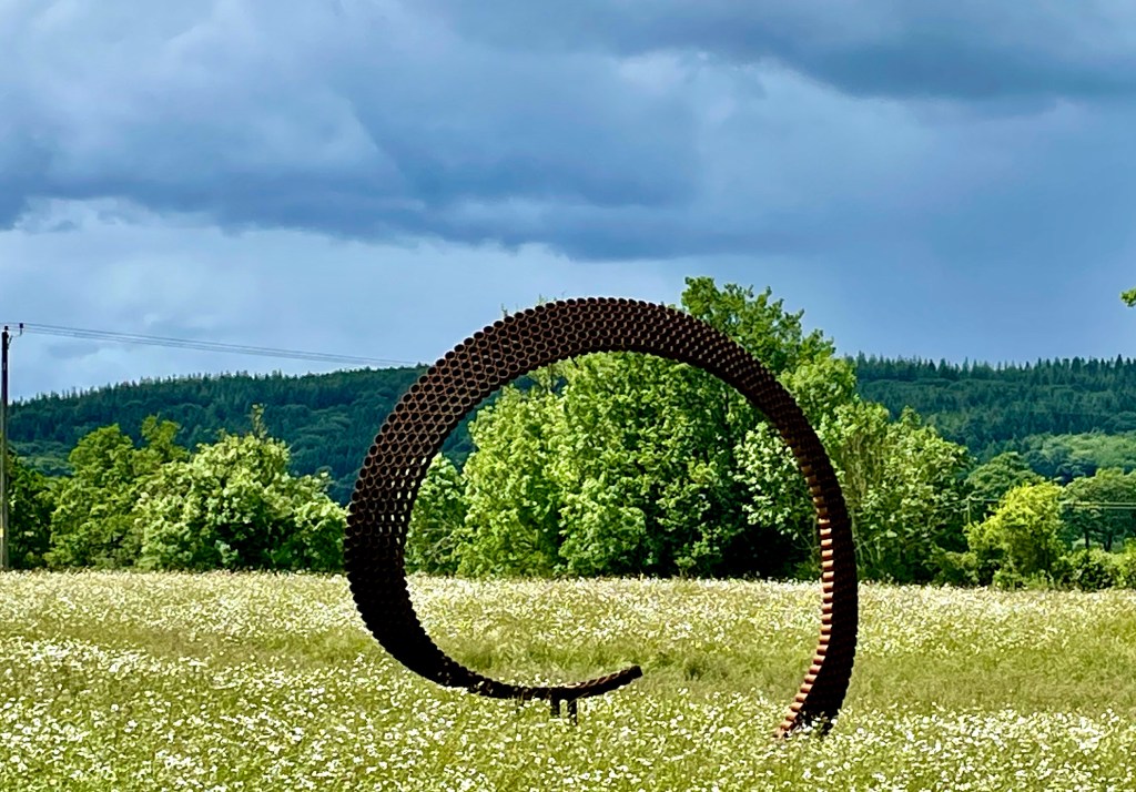 I think it may have been yesterday, or Tuesday, I forget, when I was in the middle of proper rural Herefordshire and I silently slid around the corner, a corner, in my silent electric car named “Danger Horse” when I was startled to see, in front of me, this perforated metal ring, in a field.