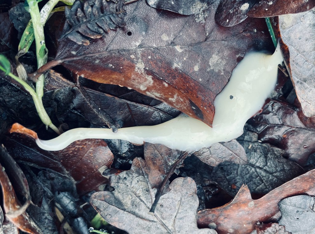 Just a quick note to tell you I had nothing to do with the substance in this photograph. It may well be in a secluded potential dogging spot (Monk wood Car Park you perverts) and it may look pretty incriminating to those of you with filthy minds, but I believe it to be some sort of organism, maybe a slime mould, maybe some sort of gelatinous worm creature, but just to let you know its not Jizz.