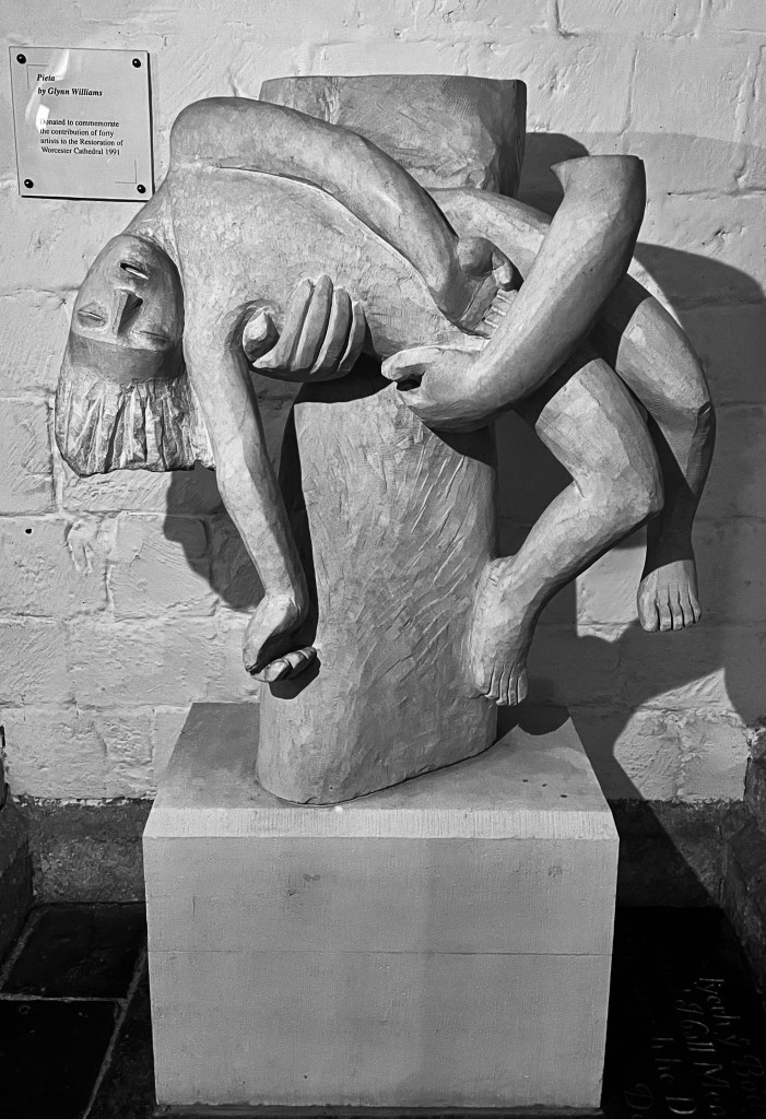 “Pieta” sited in Worcester Cathedral to commemorate some renovation work by 40 artists in the 90’s to the Cathedral. And short of having not much else to say today as I’ve spent 5 hours driving to Cardiff and back, return journey in a bloody rainstorm I’ll add, had a 6 hour meeting, ate too much lunch and did a joint presentation which was slightly spoiled for me by me (not for anyone else) by eating too much lunch. As soon as I got back I fell asleep and woke myself up snoring and dribbling on the sofa, its a good look, one which nobody saw, but now you all know about, so I think its probably not realistic to attempt writing anything more complicated as I can barely keep my eyes open. Night all, if you’re ever down in Worcester, come and say Hi and buy me a pint, I’ll be in the Lion in Clifton Upon Teme. great steaks.