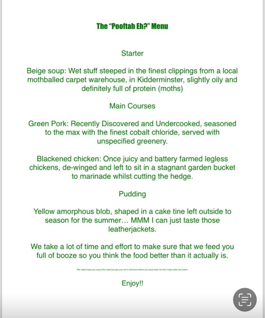 Its been a busy weekend: A dinner party of which the menu is above, then my 16 year old was having a party, and as the Saturday drew slowly closer my shoulders visibly hunched in an upper torso stress knuckle as I kept repeating the mantra “What the fuck were we thinking?”
